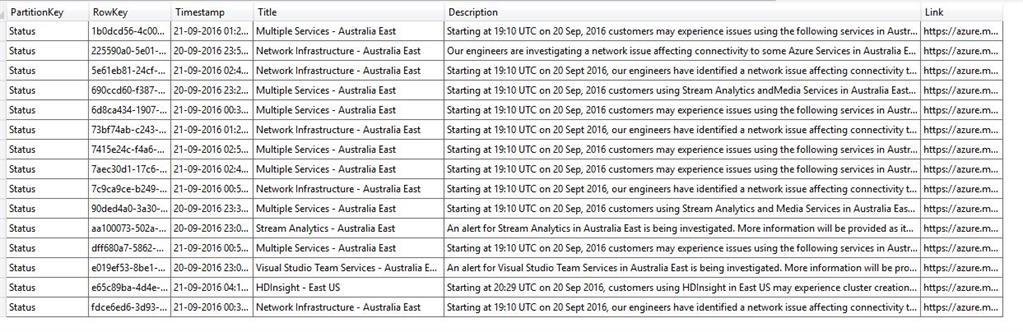 Here is the AzureStatus storage table which got updated based on Azure Status RSS Feed