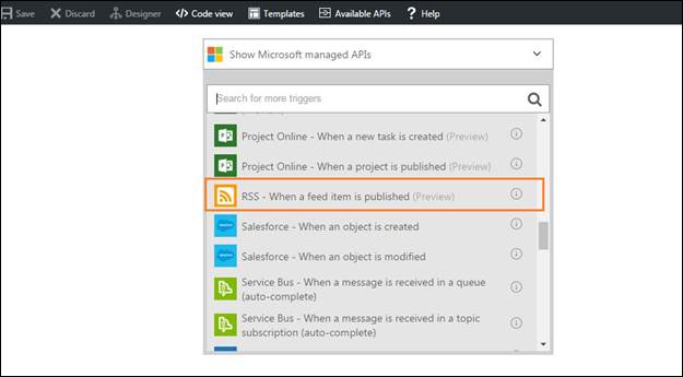 Designer shows the list of Microsoft managed APIs, essentially different available triggers to choose from. We will choose the RSS trigger from the list.