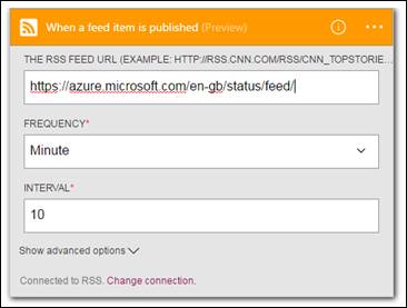 Once the trigger action is added, let’s configure it and point it to periodically scan the status.azure.com RSS feed.