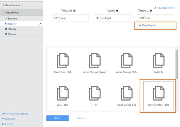 As we want this function to write entries in the Azure table storage, let’s select the output as table storage and select correct storage account i.e. ‘statusstorage’