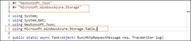 As this azure function will be interacting with table storage using Azure storage APIs so we would need to add the reference of Microsoft.WindowsAzure.Storage and also mention using statement as shown below
