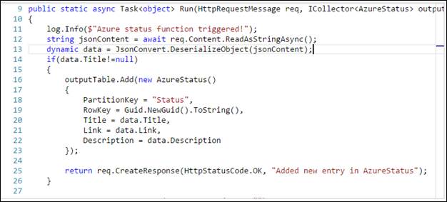 Note that we have added outputTable binding pointing to AzureStatus storage table and cleaned up the Run method.