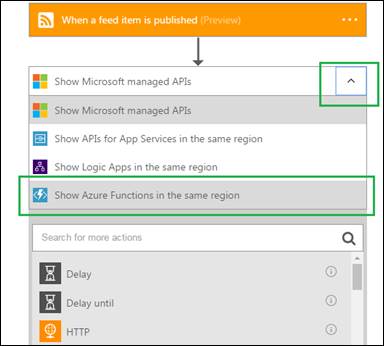 Click ok Add next step, it will show all the available Microsoft managed actions by default. Click on that small dropdown arrow right beside managed APIs box and select Show Azure functions in same region option.