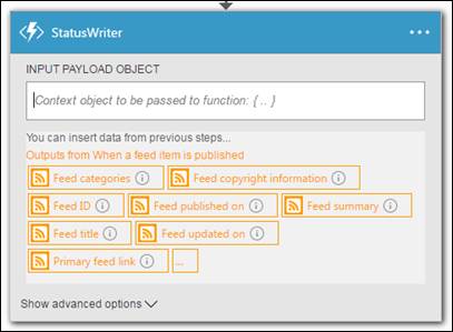 Note that it asks for input payload object which is nothing but the JSON string and you will be able to see all the available values which we can pass as input to our function. These are nothing but the outputs from previous action i.e. RSS Feed trigger.