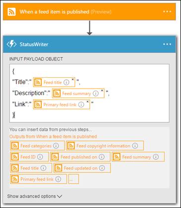Note that Tile, Description and Link are the properties of the dynamic data object which we retrieved in the function app source code. Here are we are simply initializing those properties with available output of Feed trigger.