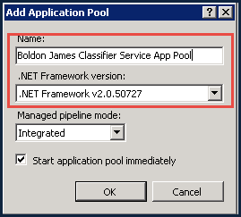 Provide a name for the application pool and select .NET version as v2.0.50727.