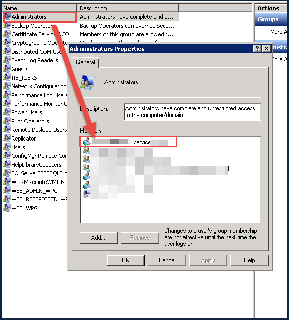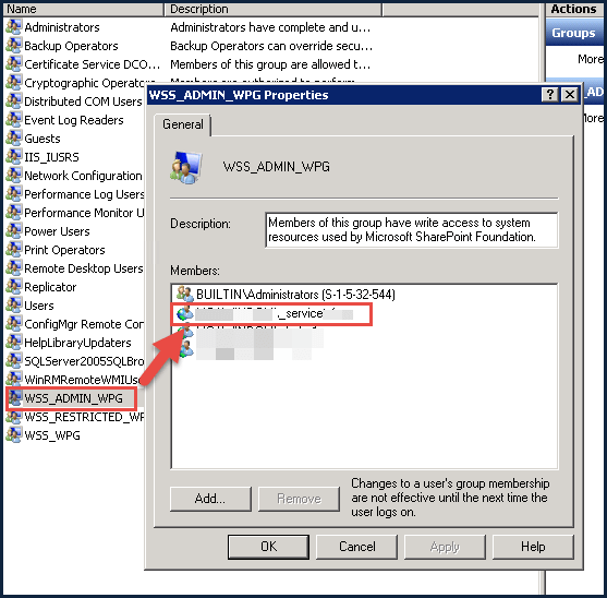 Step 4 Ensure Service Account is part of “Administrators and “WSS_ADMIN_WPG” groups