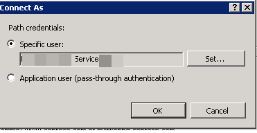 - Select the option “Specific user” as shown below and click on “Set” button to specify the credentials. Once done, click OK.