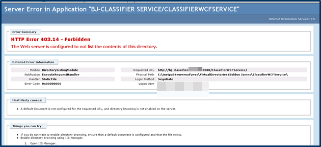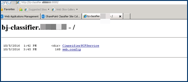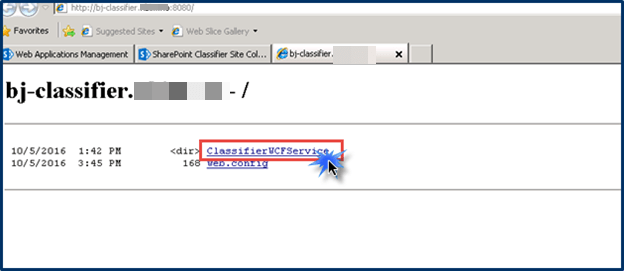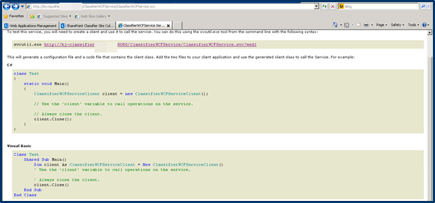 Once done, click on “ClassifierWCFService” link which you see in the image above and confirm that it loads fine.
