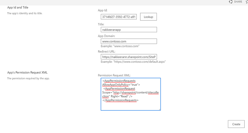 Paste the necessary app manifest xml file for providing permissions. Click on create. The following code snippet shows the read permissions for site collection.