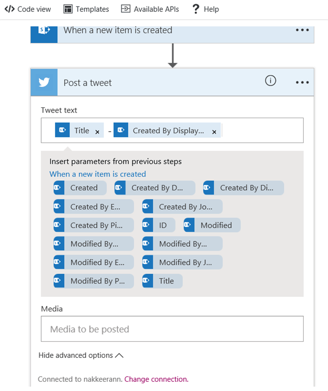 Whenever a new item is created on SharePoint list, the same data will be posted on selected Twitter handle. In this article, I have discussed about posting the data from SharePoint list to Twitter accounts, using Azure logic apps. This seamlessly posts the content from SharePoint to Twitter regardless of the user logins.