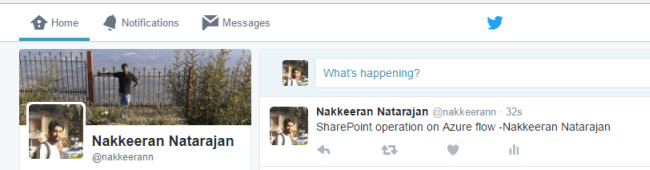 In the tweet text box, provide the necessary text to be displayed. Here, list item title is entered on the list and created user details are displayed.