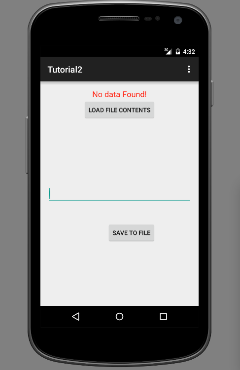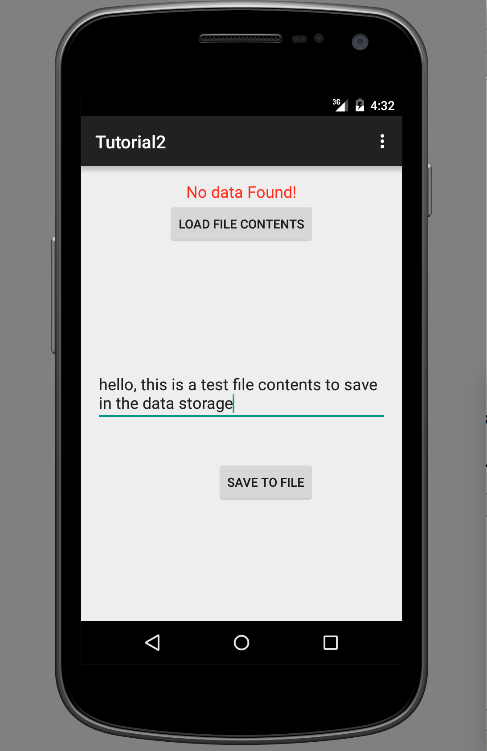 In order to write to the private storage call openFileOutput() with file name and mode (MODE_PRIVATE). This will create a file in the data storage of the application. Here I am going to show you how to write to data storage of the Android device and how we can read from the data storage of an application in the Android device. In this application I have an edit text Load file button, Save File Button and a Text VIew.