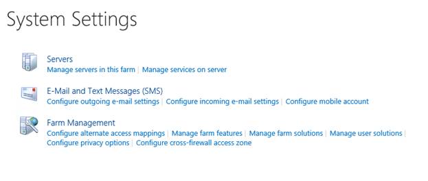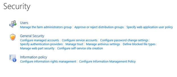 - Central Admin is configured under the categories given below.