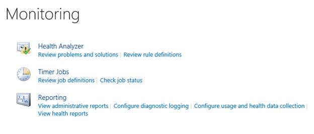 This section is divided into Health Analyzer, Timer Jobs and Reporting configuration.