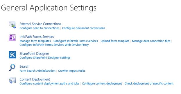 This section is divided into "External Service Connections", "Infopath Forms Services", "SharePoint designer", "Search", and "Content Deployment" configuration.