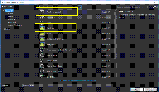 When we create a project, using wizard, the project content's main activity in "Resource/Main.axml" is layout of Main Activity and also it has MainActivity.cs. For adding new layout and activity, right click on project in Solution Explorer, select Add->New Item. New Window will open, first add new “Android Layout” and then add new “Activity”.