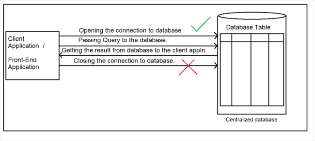 In this architecture, the programmer or developer needs to open the connection to the database before sending the queries and after the results are fetched, the programmer needs to close the connection explicitly. Every time connecting the centralised database will be more burden, as it degades the database performance. It increases the network traffic. For every operations on the database, it will hit the database everytime.