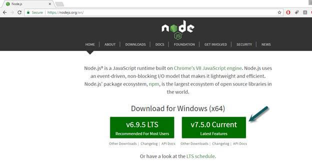 First, go to the official Website of Node.js and download the latest version of Node.js. We require Node.js because it will provide a Server for our Application to run and we need Angular 2 CLI for setting our AngularJS 2.0 Application and downloading the required files. Thus, for the installation of Angular 2 CLI, we need Node.js. Thus, first download and install Node.js.