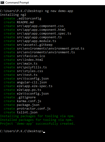Write “ng new demo-app” at the command prompt Window and press enter. In this command, “ng” indicates to Angular CLI and “new” keyword defines a new project and the name is “demo-app”. When you press enter Angular CLI installs the many files and dependencies.