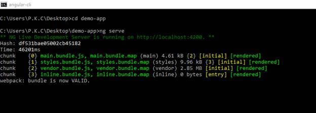 Now, navigate to “demo-app” folder and write the “ng serve” command. This command runs an Angular Server and watch for the changes, if you make any changes, it will automatically show the changes on the Browser.