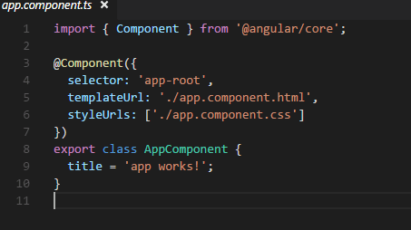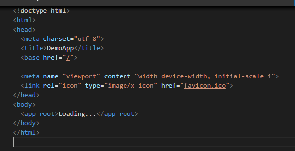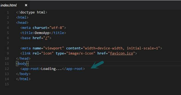 We can see in the code component above, which contains three properties, the selector defines the way to implement this component in HTML pages. To use this selector, we need to describe the “app-root” Directive in our HTML page, as shown below.