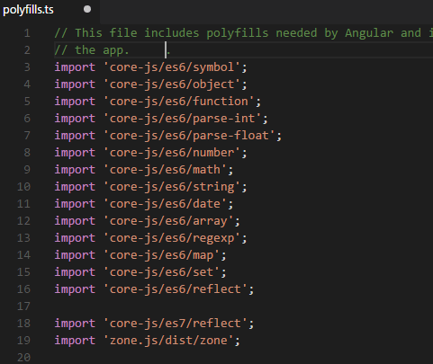 This file includes polyfills, which are required by Angular. You can add your own extra polyfills to this file. Polyfills allow us to add the functionality which we require during the development, like map, array, and date functionality.
