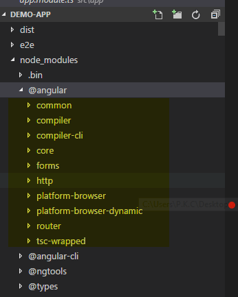 On the top of the page, you can see “import { BrowserModule } from '@angular/platform-browser';” code of line. These lines describe the modules, which we import into our root module and also define the path, where these modules exists. In the code given above, we extract the BrowserModule, NgModule, FormsModule, HttpModule, AppComponent. You can find all of the module sin “node_modules/@angular” folder.