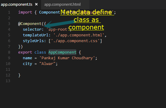 Metadata defines the way to process a class. We can define the metadata by using decorator. Let’s see our component class. In this class, you can see that we used the “@Component”, which is metadata that defines this class has a component. This metadata is attached with TypeScript by the decorator. If the “Component” is not defined, then TypeScript treats this as a simple class.