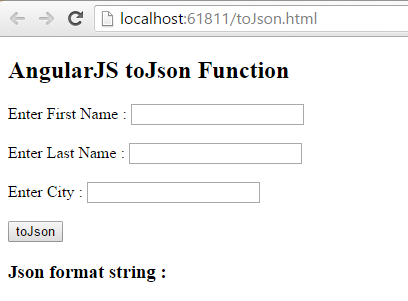 Enter the text in textboxes firstName, lastName and city, and click on ‘toJson’ button; you can see the result is in JSON formatted string as follows:
