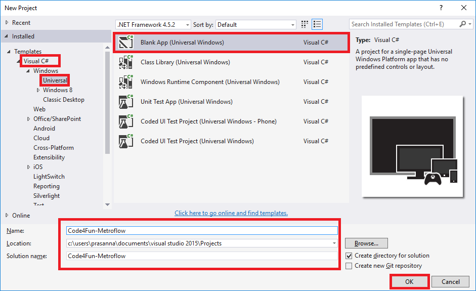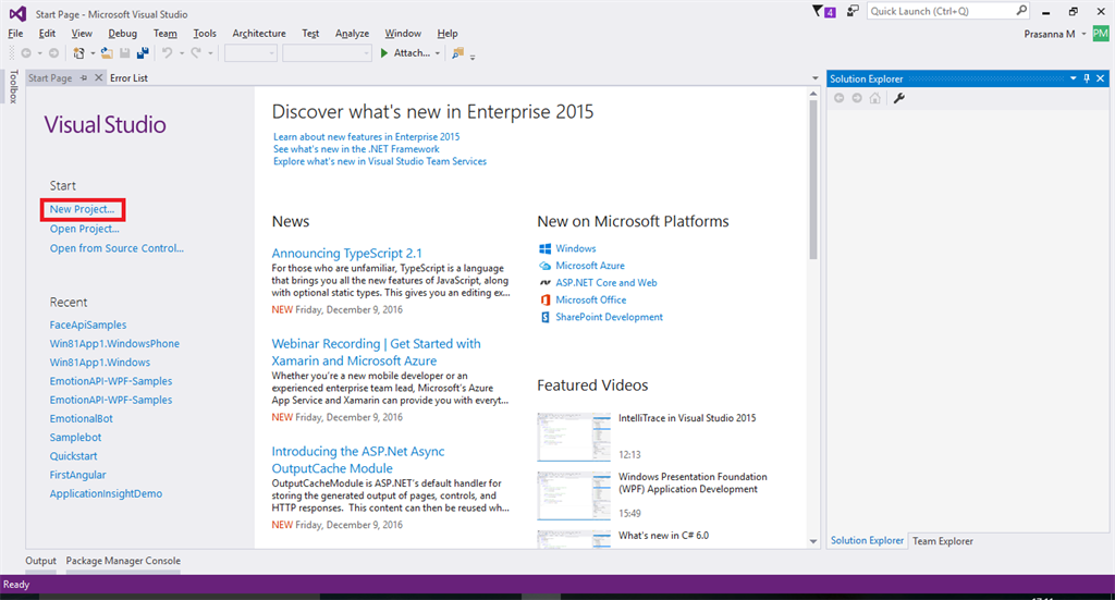 Click New Project or File and then click New followed by Project / solution and new project creation wizard appears. Select Visual C# and then Windows.