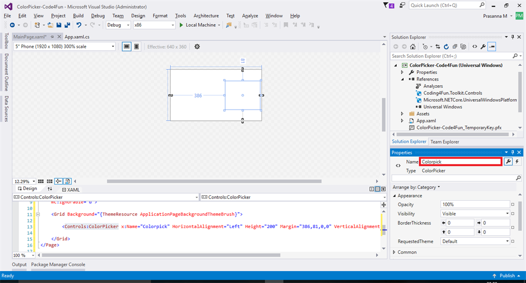 Now open toolbox and you will be able to find added tools. From that, select color picker and drag that one into MainPage.XAML and provide the name for the metro flow.