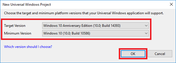 Provide File name and click create a button to created the project. Then choose minimum target version from targeted version to start developing a Universal Windows application.