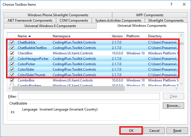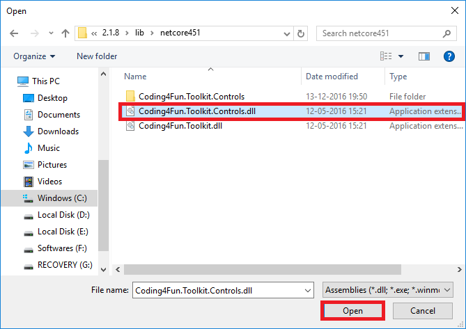 Right click on “Code4Fun” and click choose items and add the Code4Fun toolkit library file. So locate the Coding4Fun.Toolkit.Controls.dll that is available in a .nuget folder in the user's folder.