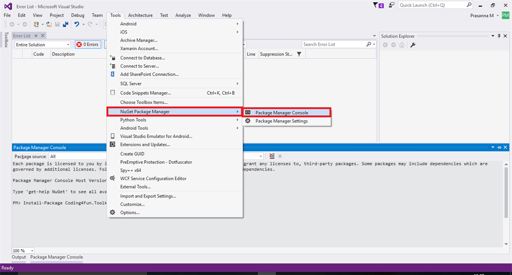 Now it's time to download and install Code4Fun Toolkit from the internet. Click Tools followed by Manage Nuget Packet Manager and then Package Manager Console. Then use the following command to download Code4Fun toolkit.