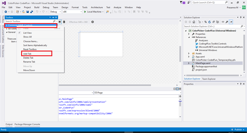 Then add the code4fun tools in the toolbar. So open toolbar and then right click on common XAML Toolkits and click Add New Tab option and provide a name for your Code4Fun tools. Here I use Code4Fun as a tools name.