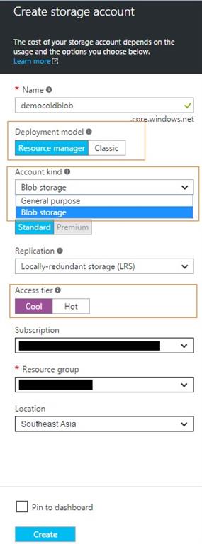 If you continue to go with blob storage kind, you will be shown option to specify which type of blob storage account you want to create i.e. cold or hot. We will select cold and continue with creation.