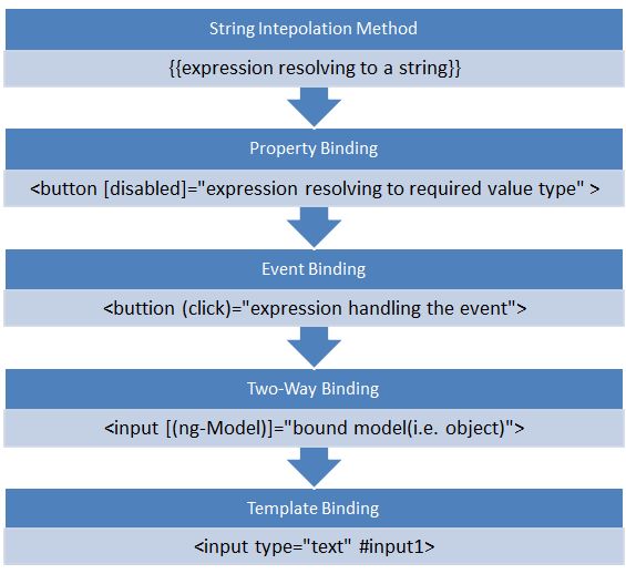 Data binding is the most important feature in the software development process. We need Data binding in each and every step, especially where we want to bind some dynamic content/data. So, Angular 2 comes with various data binding options, mentioned below.
