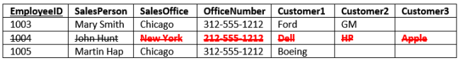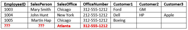 - Consider if we move the Chicago office to Evanston, IL. To properly reflect this in our table, we need to update the entries for all the SalesPersons currently in Chicago. Our table is a small example, but you can see if it were larger, that potentially this could involve hundreds of updates.