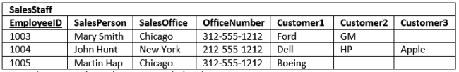 Notice that for each SalesPerson we have listed both the SalesOffice and OfficeNumber. This information is duplicated for each SalesPerson. Duplicated information presents two problems: