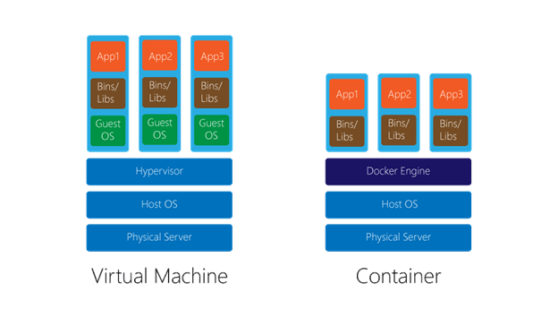 Now, the container technology has quite a fair resemblance with this analogy. Like saying, if you want your web application in production, you have to buy a whole new server infrastructure, install a server product, configure and install your binaries for your application, and then run your application. In the cloud world, you need to setup a whole new VM with an image of Windows Server or Linux and you have full responsibility of administration for that VM. More easily, you setup a PaaS service, such as Azure App Service or Google AppEngine, to host your application.