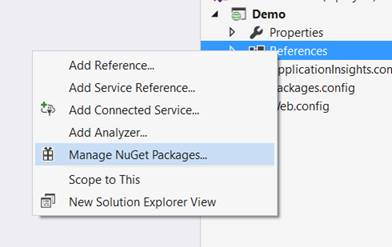 - Click Tools - NuGet Package Manager - Manage NuGet Packages for the solution.