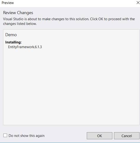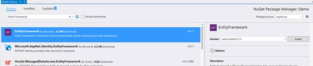 - Type"EntityFramework" in the search textbox on the top right hand corner.