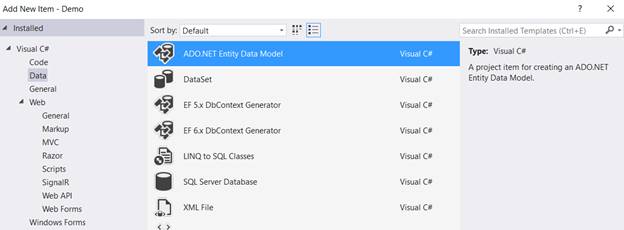 Now, let’s add a ADO.NET Entity Data Model as you need to right click on the project -> Add New Item ->Data and select ADO.NET Entity Data model, as given below.
