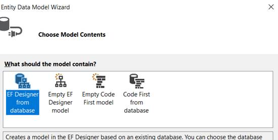 Name it as EmployeeModel and click OK. Select EF from the database option, as shown below.