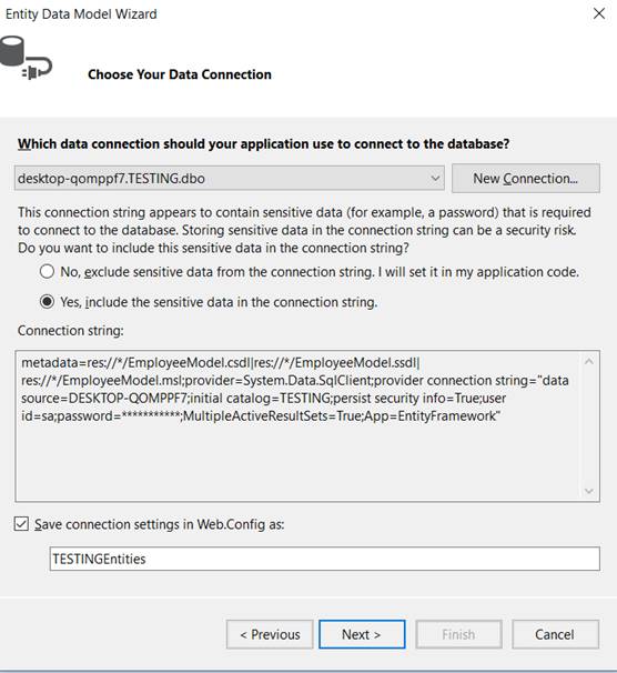 Click "New Connection" and select the Server in which you had created the database. Afterwards, select second option button (Yes, include the sensitive data in the connection string.), which is to include the connection string in our web.config file.