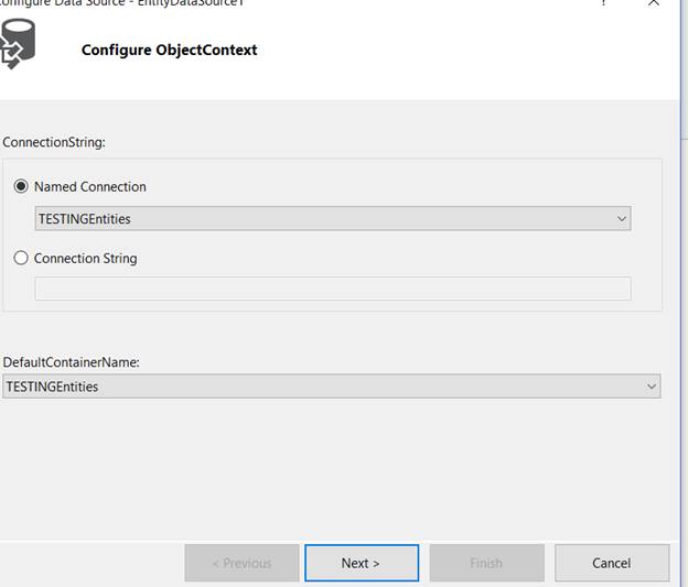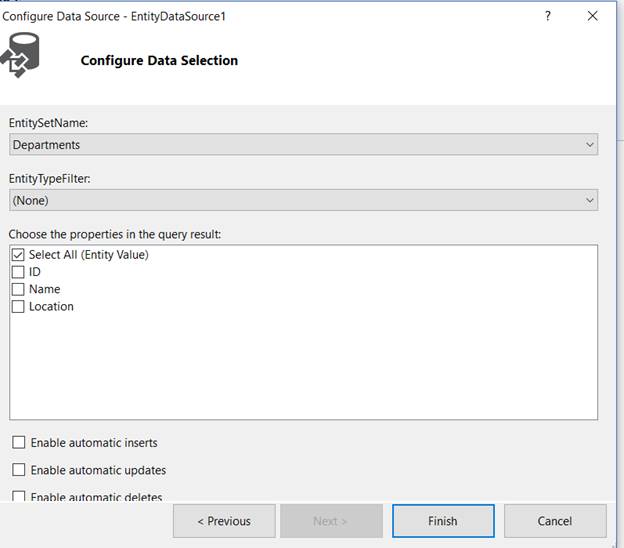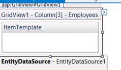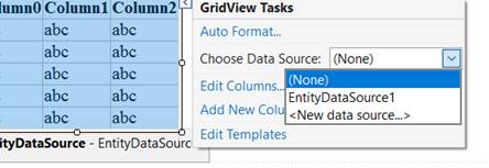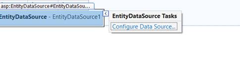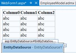 Hence, we have our EntityDataSource configured. Now, let’s associate the DataSource to the GridView control, as given below.