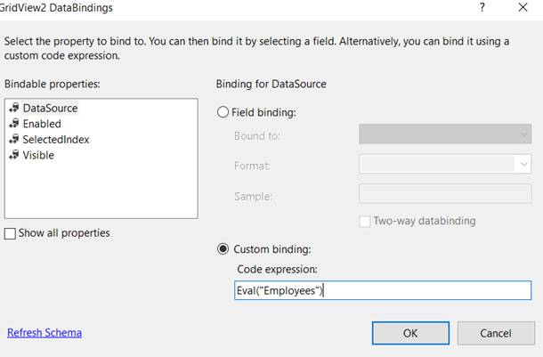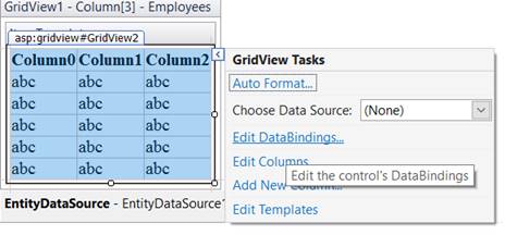 Drag and drop another GridView control. Subsequently, click on the Edit DataBindings of this GridView control, as given below.