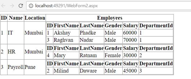 Now, look at the output. We got Id, Name and location but we didn’t get the Employee details. It is basically because we need to add one more thing here. Select the properties of Entity DataSource.
