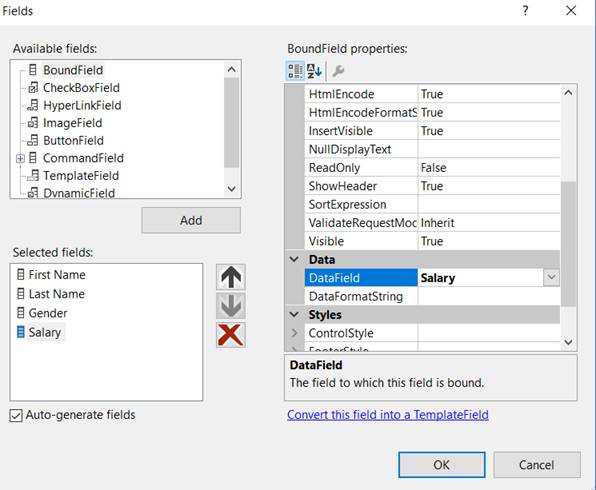 Here, we got the output. Now, we don’t want to display ID and department Id. Click Edit columns and add Four BoundFields, as given below.